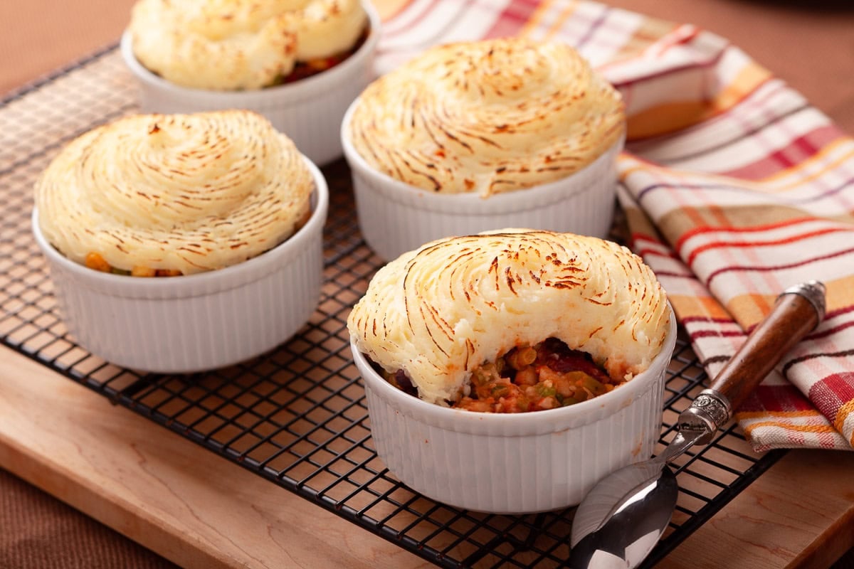 - Divide filling among 4 (10-oz) ramekins or spread into a 2-quart buttered or oiled (8×8-inch) casserole. Spoon and swirl mashed potatoes over the top to cover completely; seal to edges.